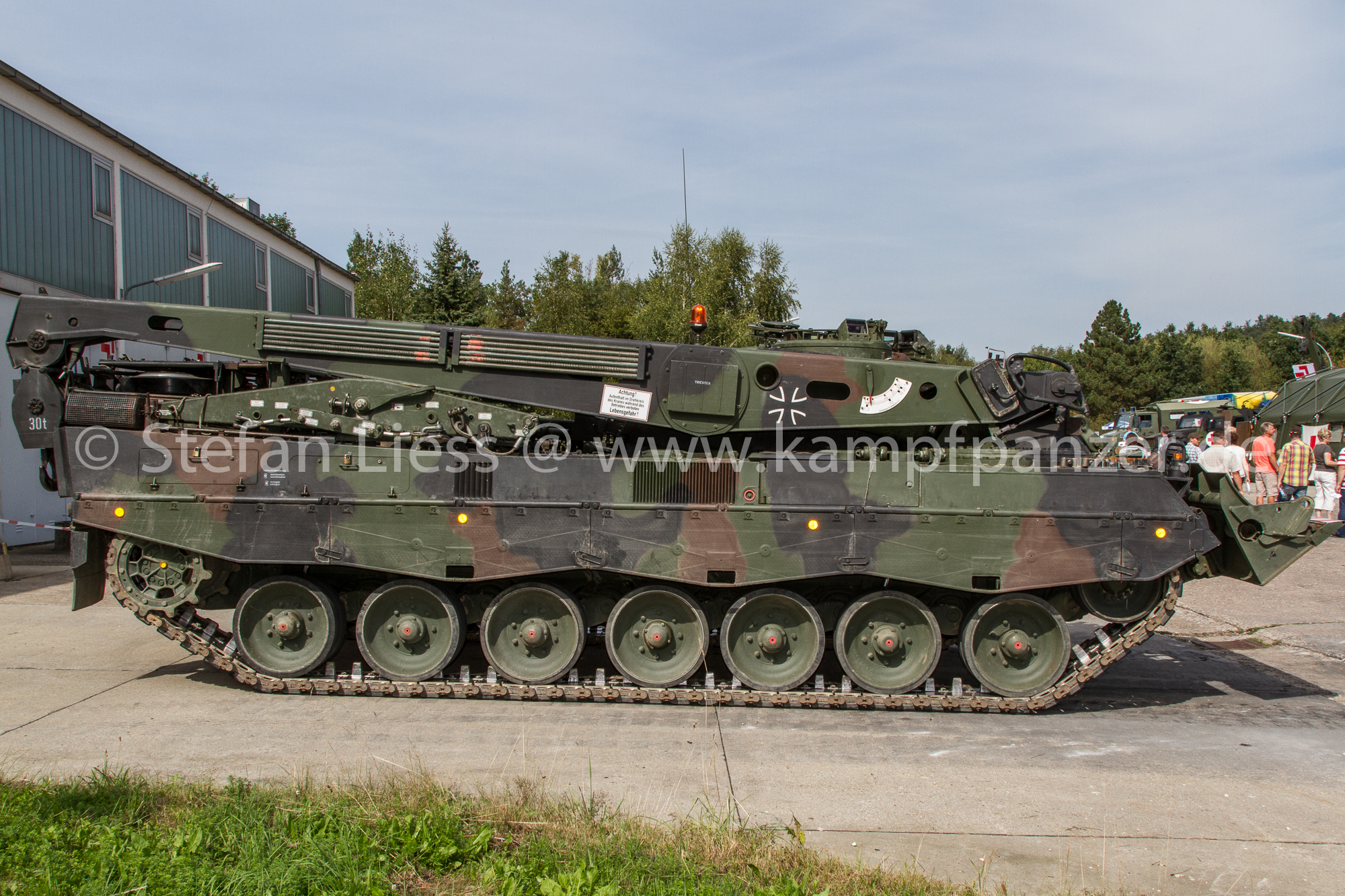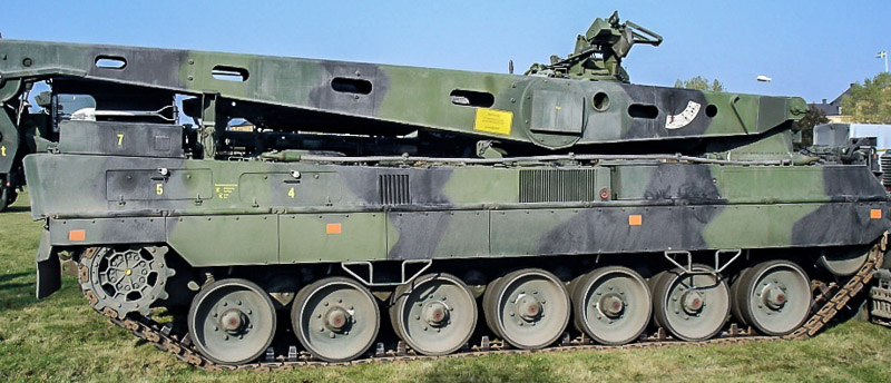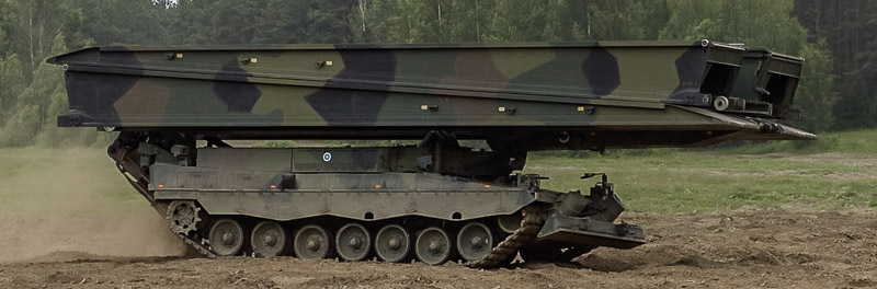 The turrets of the A4s were removed and only the heavily modified hulls were used. The use of the Leopard 2 hull and its powerpack ensure excellent mobility of the vehicle. The hull front carries a small dozer blade including hydraulically operated mounting device. The blade is used for obstacle clearing and emplacement paving, but also to stabilize the tank during bridge laying operations. The bridge laying device is mounted on top of the tank’s hull. It consists of laying arm, electro-hydraulic drive and control unit. It also offers storage boxes for tools and personal equipment. The bridge itself is of the two parts sliding type, with the rear part getting transported on top of the front one. During operation, the rear part is moved to the rear part of the tank, lowered and combined with the front part. Then the bridge is laid as one part over the vehicle front.