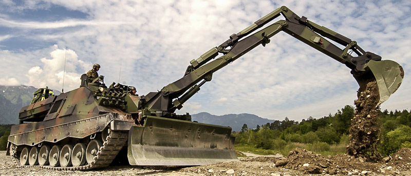 Instead of the crane, the Wisent 2 can also be equipped with an excavator arm. Refitting one of the two is don e within 5h, which is quite reasonable for a conversion of the vehicle. The excavator turns the vehicle into a proper engineer vehicle, able of executing a large variety of engineering tasks like digging positions or clearing obstacles. The excavator bucket can hold a total of 1.3m3 and the digging depth is 4.4m.