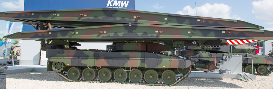 At Eurosatory 2014, KMWeg presented a new version of the Leguan bridge layer. The tank features an upgraded launching vehicle, as well as a new bridge design.