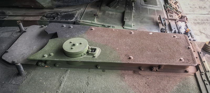 The normal turret of the Leopard 2A4 has been replaced by a special super structure, which looks somewhat similar like the turret of the CV90, but it’s much wider. It contains the stations for the operator (right) and the commander (left). The stations can be accessed thru individual hatches in the roof. Both hatches are equipped with several periscopes, enabling a larger field of view. A large, semi transparent periscope is mounted in front of the commander’s hatch, similar to the one used with the Leopard 2A5. The design of the actual hatches is also very interesting, as it somewhat reminds on the T-72. The commander’s hatch also hols a mount for an AA-MG. It is not intended for the MG3, used by the Finish Army with the Leopard 2. Instead a 12.7mm NSVT/Kord can be mounted. This makes the Leopard 2R the only Leopard 2 version using such a weapon.