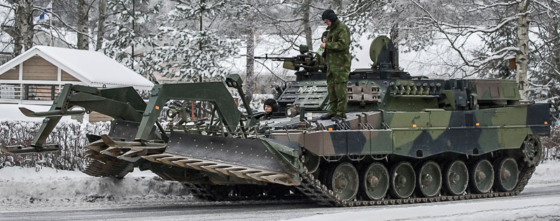 The Leopard 2R (Raivauspanssarivaunu: Mine Clearing Tank) is a special mine clearing vehicle based on the Leopard 2, which was developed for Finland. The basic concept is comparable to the American ABV, based on the M1 Abrams, but without the Mk 155 LCDCS.