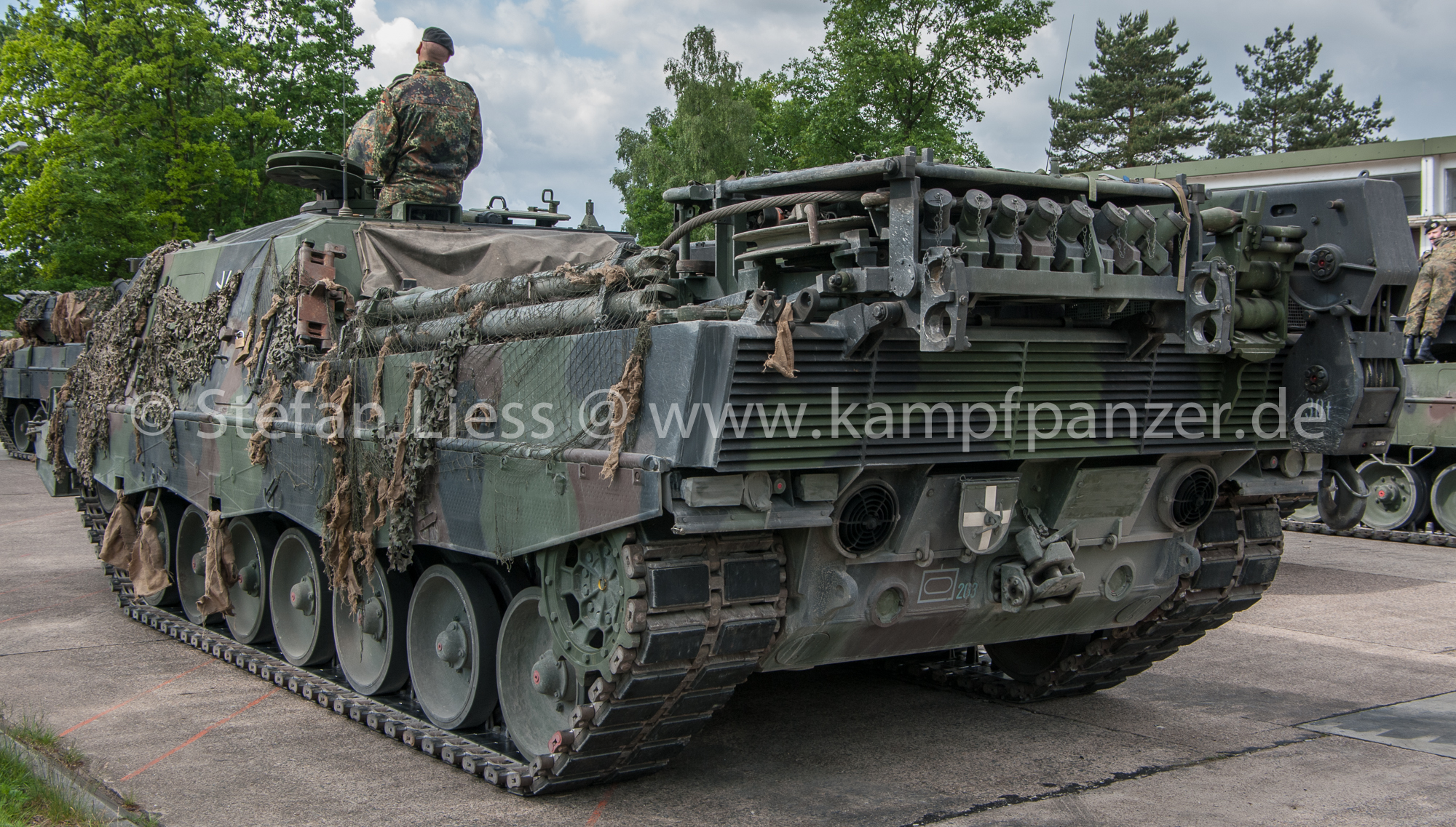 Turret front and rear are equipped with laser detectors. In case of incoming signals, the system will warn the crew automatically. It can also turn the turret in the direction of the incoming laser pulse and trigger the smoke grenade launchers. They are the original ones used by the Leopard 2.
